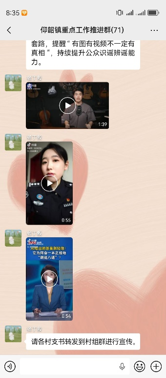 线上线下齐发力,筑牢识谣辨谣防线。线上,通过短信平台向群众推送“智辨AI”辟谣提示短信16000余条,依托县、乡、村三级微信工作群、村组便民群等线上阵地,层层转发辟谣科普短视频,打通基层宣传“最后一公里”;